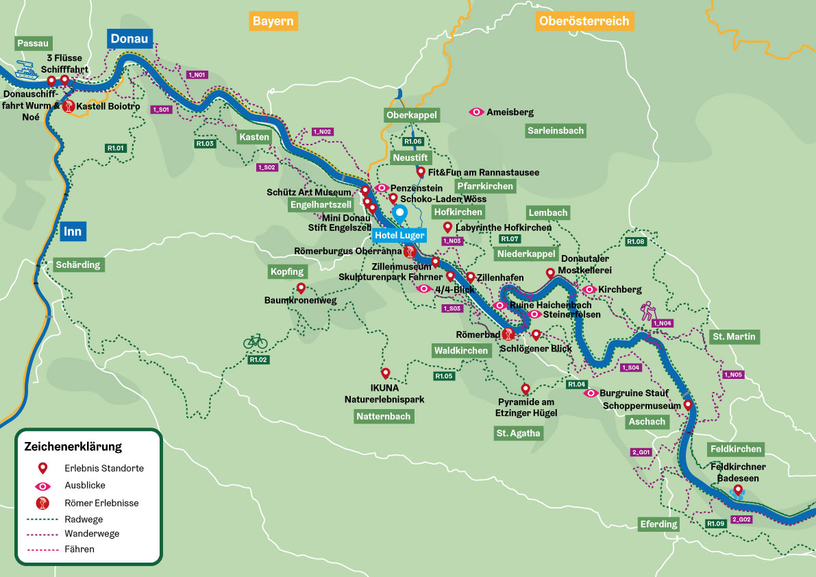 Or take the cycle ferry at Schlögen to the south bank on the Danube cycle path stage south bank Schlögen-Linz to Aschach and continue over the Danube bridge on the R1 north bank to the Feldkirchen bathing lakes or to Bad Mühllacken to the Waldbad.
